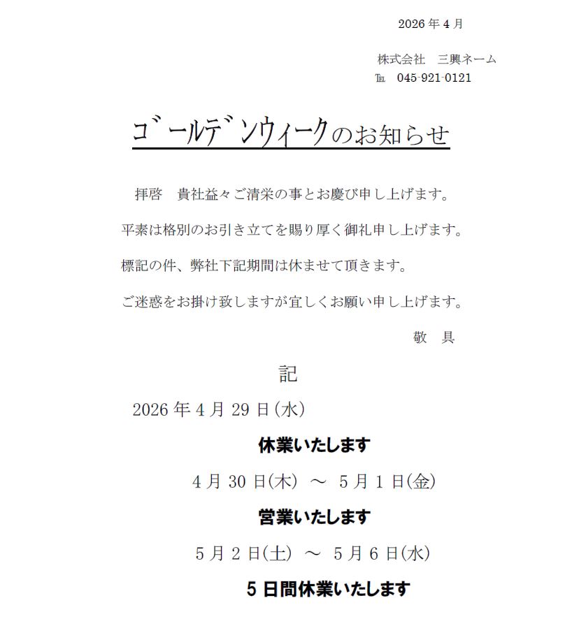 神奈川県、横浜市の数ある印刷会社の中から、三興ネームのHPをご覧いただきありがとうございます。数多くの産業機器メーカー(防災機器・建機・情報通信・半導体・理科学機器)のお客様と直取引をさせていただいております。